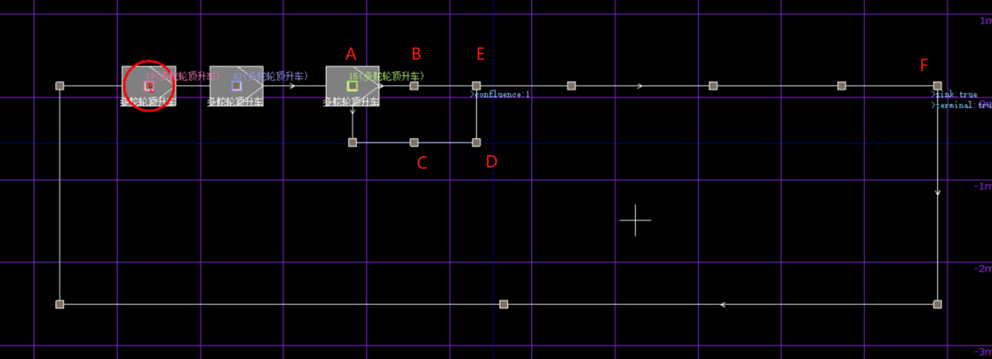 场景:某主线AGV,路径是环线,小车会按照车号顺序依次行驶。由于车型不同,装配工位因此不同,存在分支路径:会需要AGV停靠在B、C点装配并需要不确定的时间。而在汇入E的时候需要保证原先的跟车顺序。根据Reachability特性,可以实现该功能,方式如下: