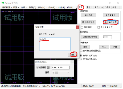 在”概况“页,点击”手动输入位置“,输入"0, 0, 0"以为建图原点坐标。