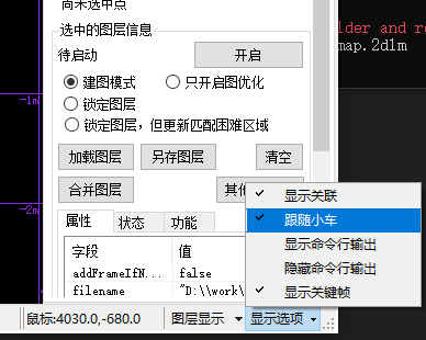 勾选Detour窗口右下角的“显示选项 / 跟随小车”菜单,Detour将使机器人保持在地图窗口中央,方便建图时观察机器人和环境(点云)的相对位置。