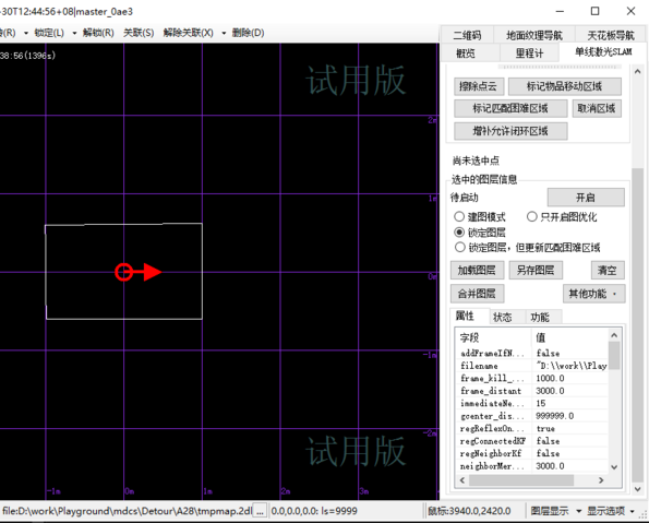 点击“另存图层”按钮,在Detour目录下保存2DLM格式的激光地图,然后修改“属性”列表的"filename",将其指向刚保存的激光地图文件。最后使用主菜单的“导航配置 / 保存”,把更新后的配置保存到Detour同目录的Detour.json。