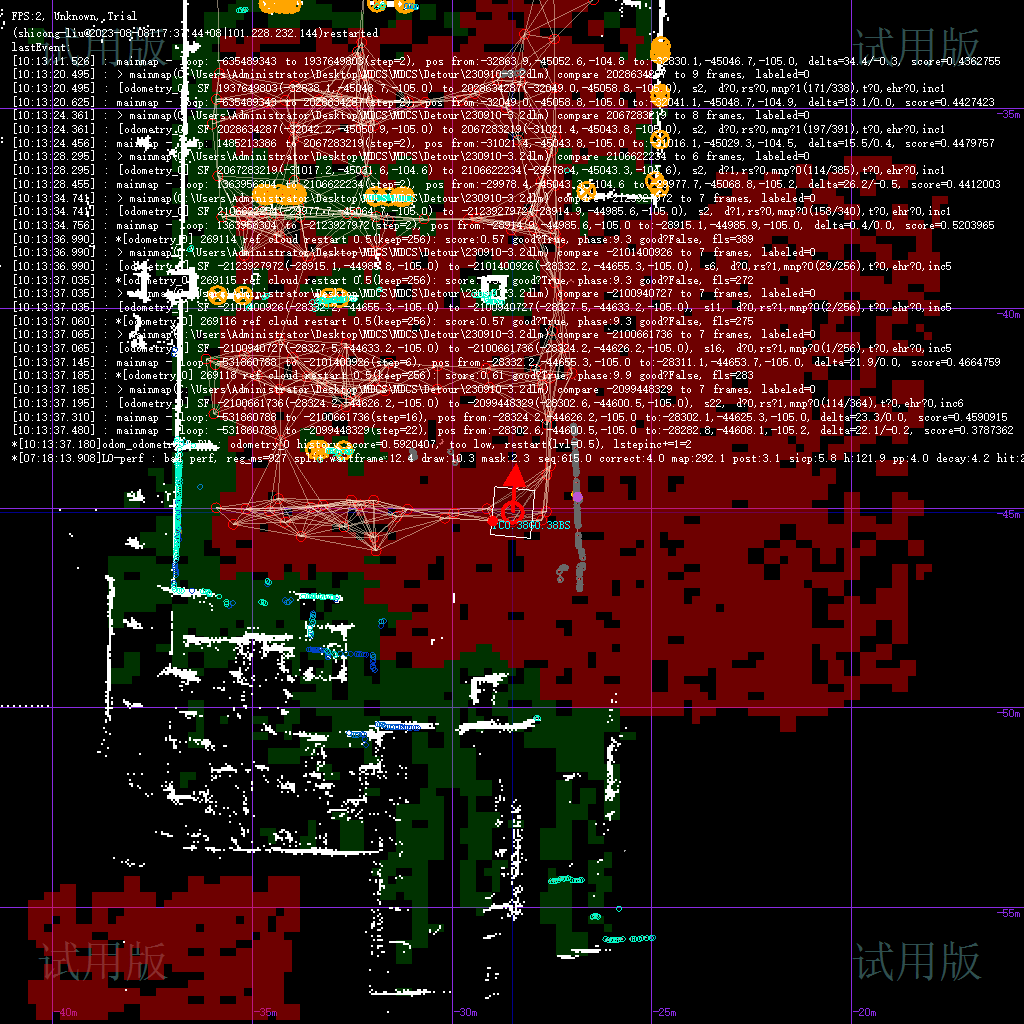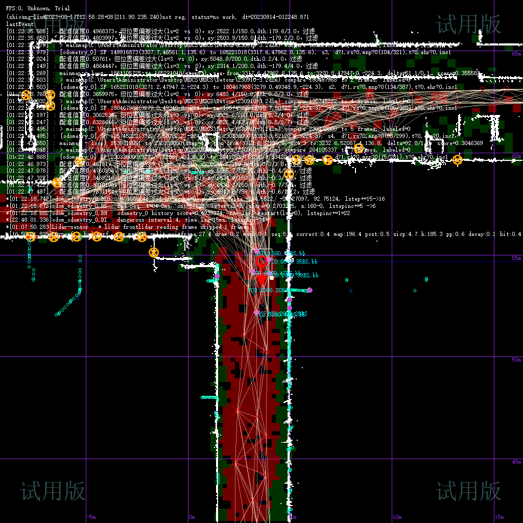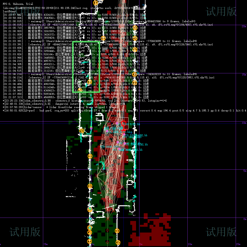 图2-9,由于里程计偏差较大,导致回环检测一直失败,01:20:51.960到01:21:01.129的日志可见。AMR一路靠激光里程计倒走出去,由于激光里程计角度精度较好,因此在出去路上未跑歪。