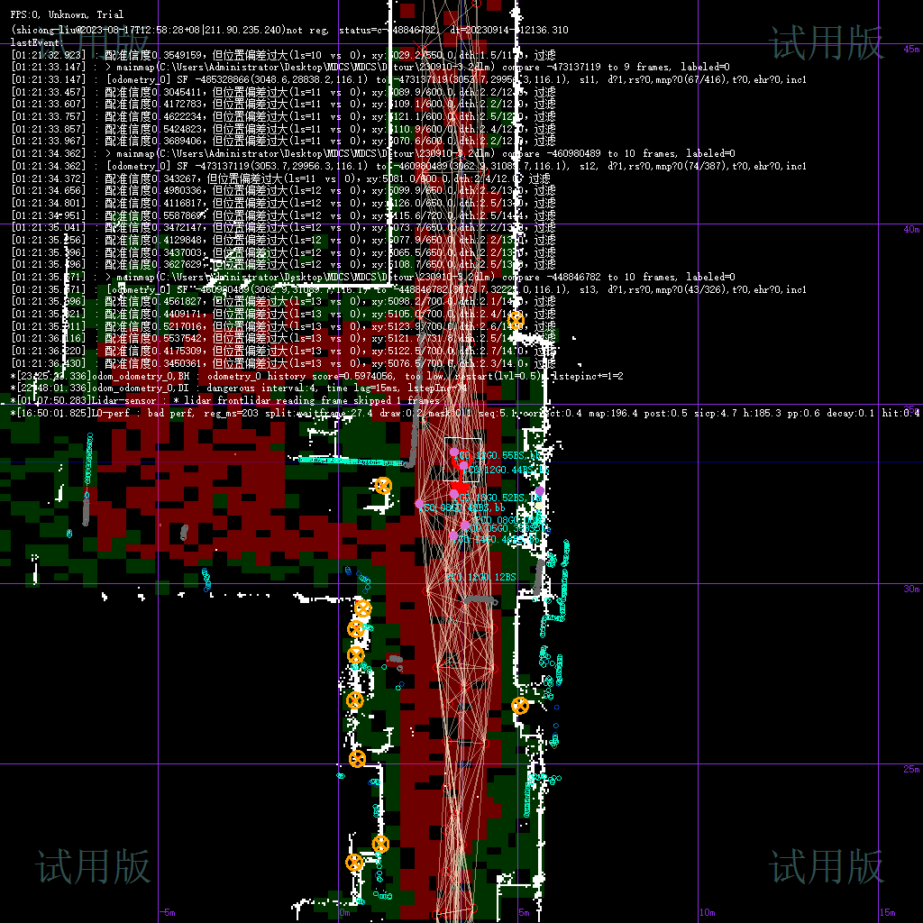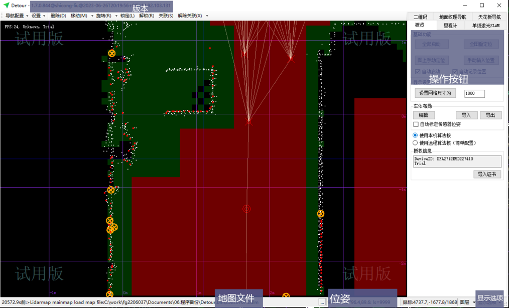 说明:单线激光SLAM无需授权,因此地图窗口的“试用版”提示可以忽略。如果使用高级功能,如地纹导航,则需要授权,否则高级功能无效。