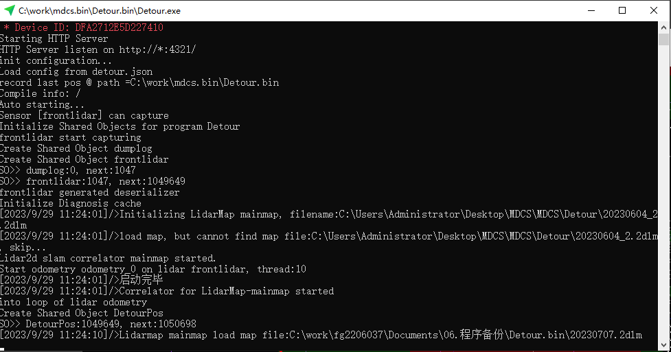- 16:54:21.453。激光里程计输出,从关键帧9120(关键帧编号后4位)跳到下一个关键帧8501,使用的激光地图是230910-3.2dlm。关键帧编号后面的括号是关键帧位姿:x、y、θ。score(配准分数)是0.690376,非常好。