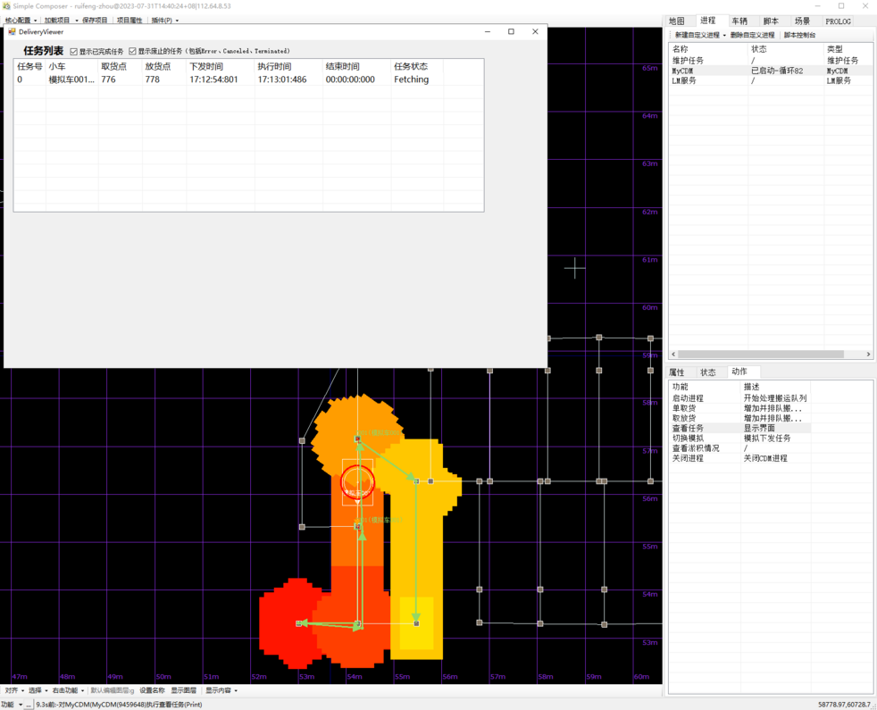 图3-3中,模拟车001行走的路线是彩色的(橙色渐变到绿色),这表示包络线。