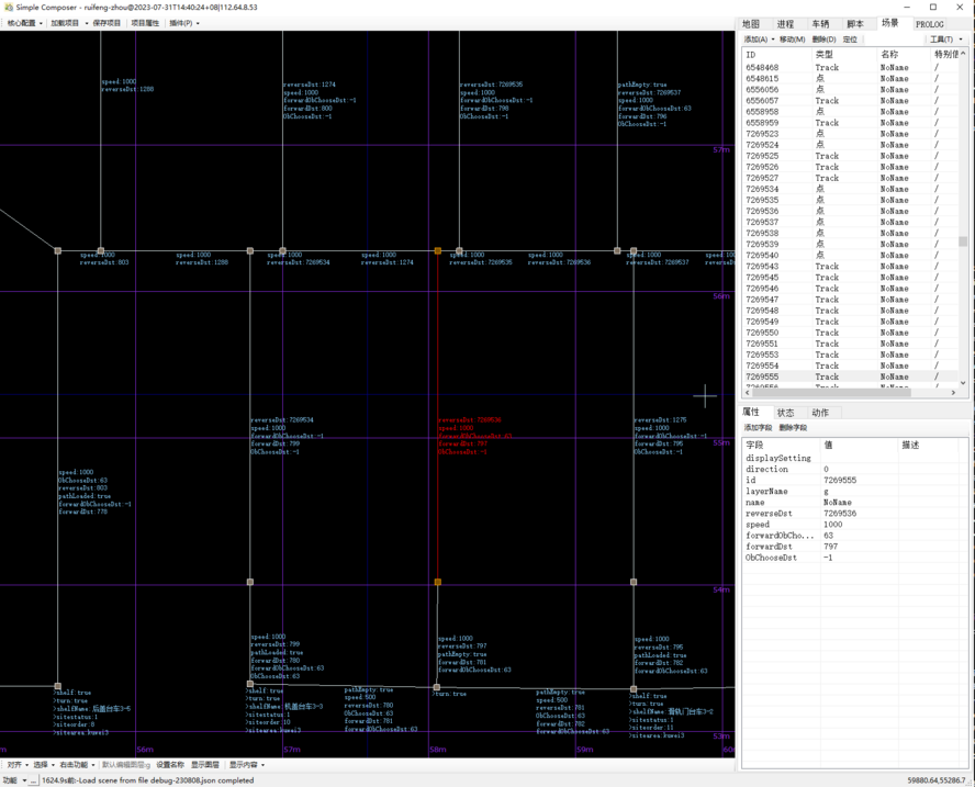 路径和站点在S的“场景”标签中管理。使用鼠标滚轮放大地图,并选择一条路径(图中红色线),窗口右下方的“属性”标签显示该路径属性。这是一条双向路径,属性中的direction=0。双击direction属性可修改其方向,1、2分别表示从A到B和从B到A(单向路),单向路径的方向以箭头表示。