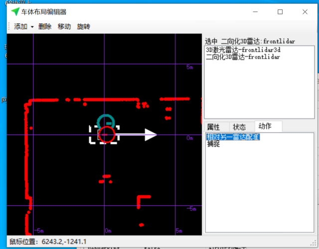 1. 在车体编辑器选择待配准的雷达(假设是backlidar),使用“移动”“旋转”菜单来移动或旋转雷达(按下鼠标左键,移动后松开,鼠标移动代表旋转或移动的距离);或者修改xyth值进行微调。