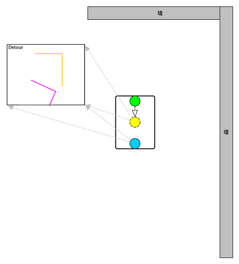 把AGV/AMR开到墙角,使两个激光雷达能够看到墙角轮廓(有共同视野)。图2-1中绿色圆圈是车头雷达,已标定(方法参见【激光外参标定】),因此它的逻辑位置在运动中心(黄色圆圈),在Detour上可见车头雷达观测到的墙角轮廓(图中黄色线段)。