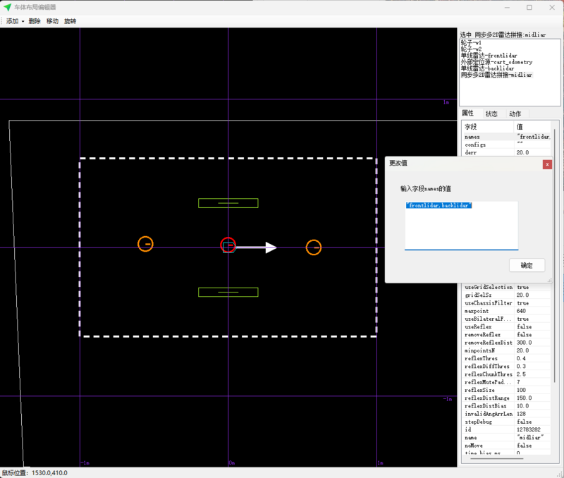 在前后激光雷达标定完毕后,在车体布局编辑器中添加一个“同步多2D雷达拼接”类型的雷达,放在车体中心,命名为"midlidar",如图3-3所示。