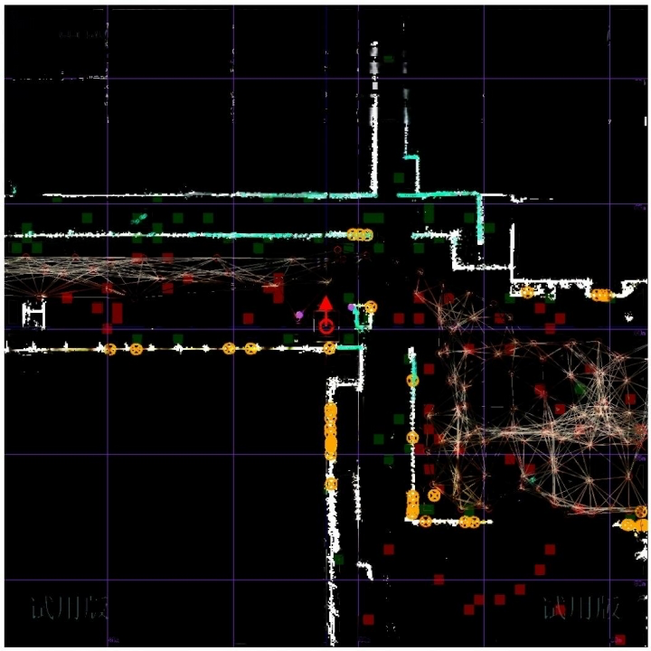 备注:图2-6是平面库场景,图中AMR左侧是平面库,停放料车;右侧是带移门输送线。这是典型的激光不良场景,因为平面库中的料车随机变化,属于大动态环境。而输送线移门由于随机开合,也不能用于建图(移门拉开是输送线轮廓),也是大动态环境。SLAM 可依赖的唯有图中上方的小尺寸轮廓(柱子)。这种场景应使用其他传感器来补全,比如基于IMU (惯导传感器)的轮里程计,利用Detour 的多里程计耦合能力应对大动态场景。