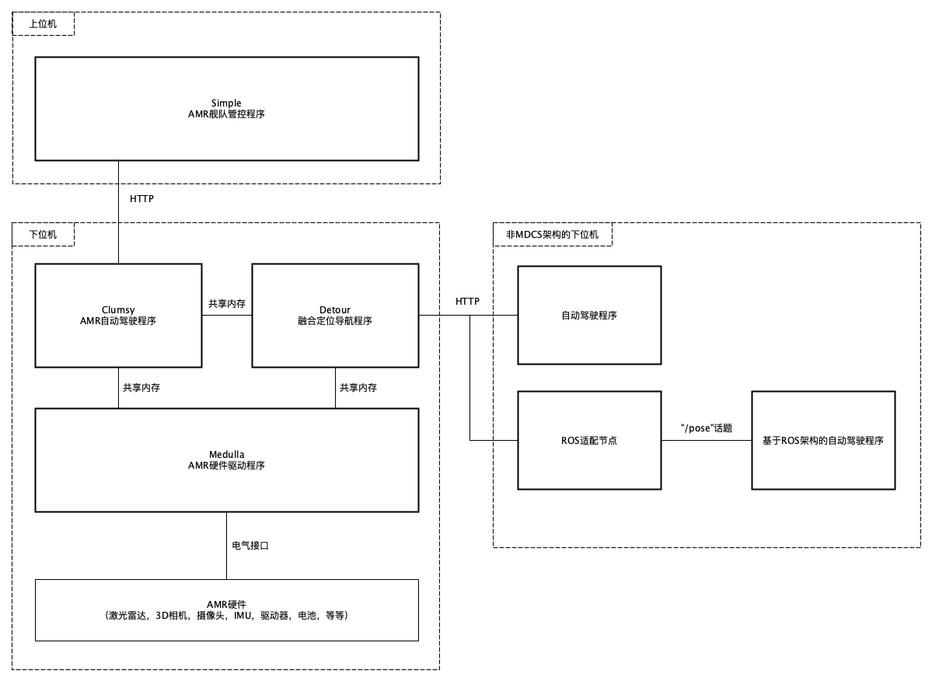 Clumsy、Detour和Medulla运行在下位机(嵌入式工控机),使用共享内存机制实现进程间高速通信。下位机推荐使用Windows10+操作系统,以便利用Windows生态丰富的工具,也支持Ubuntu16+。Simple通过HTTP向Clumsy发送任务及更新AMR状态,运行在Windows10+。