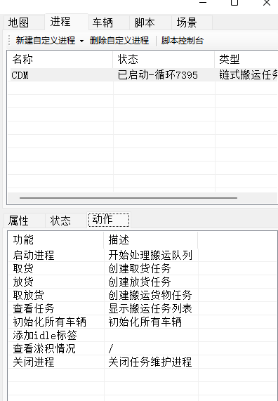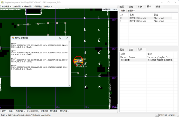 选择脚本条目,双击“显示脚本”动作,可看到脚本内容。脚本使用 JavaScript 语法,Go 是行驶指令,指令小车跟踪直线轨迹行走。除此以外还有取货、放货、SSC 切换等指令,参见 Clumsy 的动作代码。