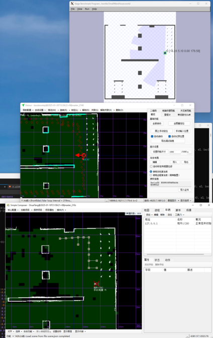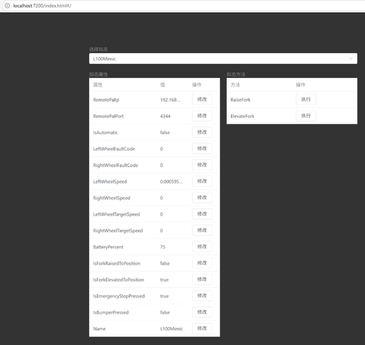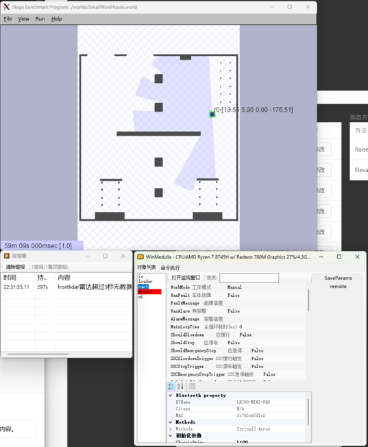 L00地牛的PLC负责控制电机驱动器和点位开关,通过串口与车载工控机通信;倍加福R2000激光雷达直连车载工控机网口。仿真L100地牛用Mimics模拟PLC,Mimics是MDCS工具链的设备模拟器,可模拟电气模组,并集成Web界面来修改设备运行参数。用Robopal的180度视野激光雷达代替R2000激光雷达,以便模拟货物遮挡雷达情况下的建图与定位。