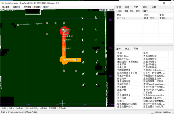 Simple规划出路线后,模拟小车顺序走过规划路线的站点和路径,根据站点和路径的属性编译出相应的动作指令,比如行走、停车、旋转、取货等。