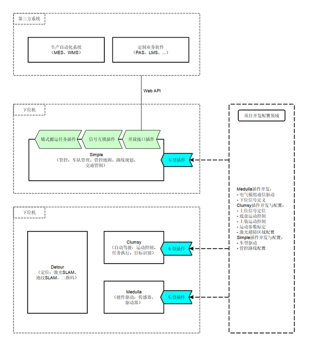 • 上位机。用于管理车队的工控机或服务器,部署Simple(管控子系统)以管理车队、任务,通过开放接口向第三方系统开放自动化集成能力。