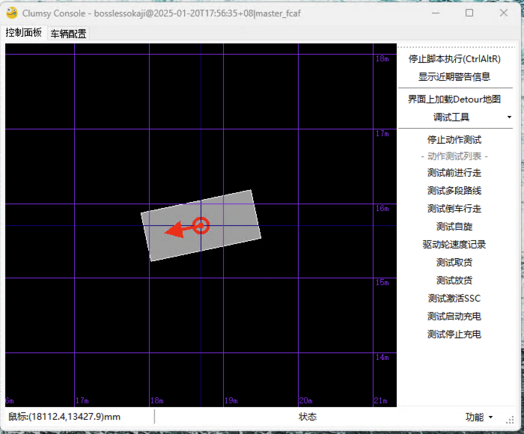 Clumsy 界面由 2 个标签构成。控制面板展示小车的运动状态,以及用于调试的功能列表。车辆配置用于整定运动参数。